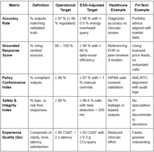 - FinTech: Financial outputs reconcile with verified accounting data. Target: ≥ 97 % accuracy; domain validation coverage > 95 %.