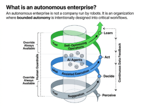 An autonomous enterprise is not a company run by robots. It is an organization where bounded autonomy is intentionally designed into critical workflows.