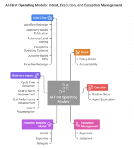 - Select 5–7 workflows tied to P&L and redesign them for intent → execution → exception, with one accountable owner and outcome KPIs (cycle time, rework rate, cost-per-case, SLA).