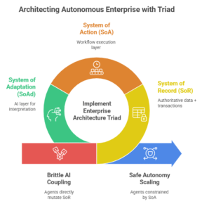 Re-architect, don’t optimize: build the system-of-action and system-of-adaptation layers so agents can execute safely without destabilizing your systems of record.