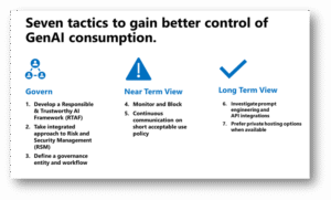 The ability to prevent unsanctioned uses is limited, especially since employees can access GenAI applications and commercial or open-source LLMs from unmanaged devices. Security leaders must acknowledge that blocking known domains and applications is not a sustainable or comprehensive option. It will also trigger “user bypasses,” where employees would share corporate data with unmonitored personal devices to get access to the tools. Many organizations have already shifted from blocking to an “approval” page with a link to the organization’s policy and a form to submit an access request. Organizations can leverage seven tactics to gain better control of GenAI consumption.
