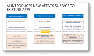 - Adversarial prompting: The application direct and indirect prompts are a prominent attack surface. The notions of “prompt injections” and “adversarial prompting” emerge as threats when consuming third-party GenAI applications, or when building your own. Early research work shows how to exploit application prompts. Security teams need to consider this new interface as a potential attack surface.