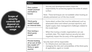 Implementing controls for GenAI applications will heavily depend on the AI model implementation. The scope of security controls will depend on pattern of AI usage like if an application includes:
