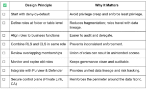 - Governance accelerators – Define reusable data-domain roles and mappings; speed deployment of OneLake Security at scale.
