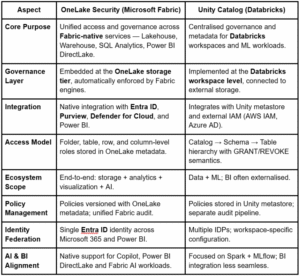 - Hybrid ecosystem guidance – Many enterprises will operate both Databricks and Fabric. Partners that can map when to use Unity Catalog vs. OneLake Security — without bias or lock-in — will lead the market.