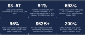 Accenture: “LLMs will become the new influencers, driving shopping decisions through recommendations — identifying how to best link LLMs to a retailer’s product and brand information will be key to whether a brand’s product appears as a recommendation.” Adobe: 693% surge in GenAI holiday traffic. GenAI is enabling retailers to generate product descriptions, marketing copy, imagery, and video at a fraction of the previous cost — but the quality and accuracy of AI-generated content directly determines AI agent recommendation probability.