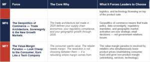 A force earns a place in this framework if it meets three criteria: (1) It is structural, not cyclical — it does not reverse when macroeconomic conditions change. (2) It has compounding effects — the advantage of early movers grows over time, and the cost of delay increases. (3) It forces a binary choice — retailers cannot remain neutral; every month of inaction is itself a strategic decision.