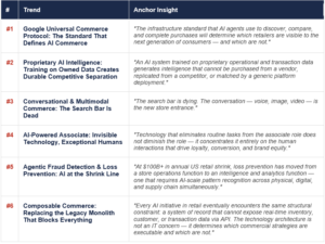 • Invisible checkout inside UCP (Trend 1) enables purchase completion without visiting a retailer’s website — the checkout becomes part of the AI conversation