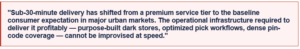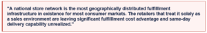 • Same-day delivery becomes operationally viable at scale only with store-as-node architecture — the national fulfilllment center cannot physically deliver in 2 hours
