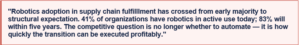• Develop a robotics integration roadmap starting with highest-volume, most repetitive fulfilllment tasks — the ROI case builds fastest at scale