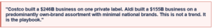 • Kirkland Signature is Costco’s #1 loyalty driver — customers renew their $65 membership specifically to access it, demonstrating that private label can be a premium brand, not just a cheap alternative