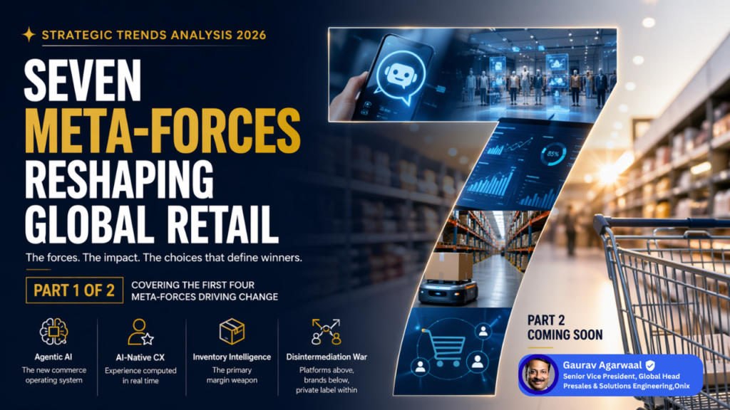 Retail has reached a structural breaking point. Seven forces are converging simultaneously, each reinforcing the others, each demanding a response that goes beyond incremental improvement. This analysis — synthesized from Gartner, McKinsey, Accenture, Deloitte, NRF, WEF, IDC, and direct operator intelligence from Walmart, Amazon, JioMart, Costco, and the NRF Top 50 — is designed to be the definitive strategic trends analysis for retail leaders who need to act in 2026.